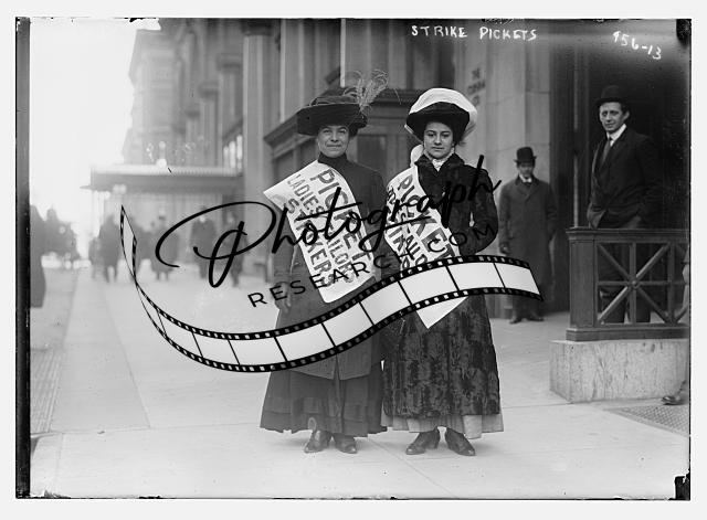 Summary: Photograph shows two women strikers from Ladies Tailors union on picket line during the 'Uprising of the 20,000,' garment workers strike, New York City. (Source: similar Bain photograph: LC-USZ62-49516)