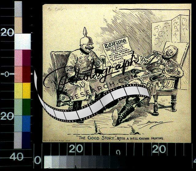 Summary: World War I cartoon shows a disconsolate peasant (labeled 'German People') pondering a paper reading 'President Wilson's Reply to Rome.' He thinks, 'Wonder if I have as little to say as he says I have.' In August 1917, Pope Benedict XV issued a call for peace, asking both sides to compromise and make concessions. President Wilson rejected the request, saying that the Germans had 'planned to dominate the world.' He insisted that the fault lay in the German government, not in the German people who were under the domination and control of the government.
