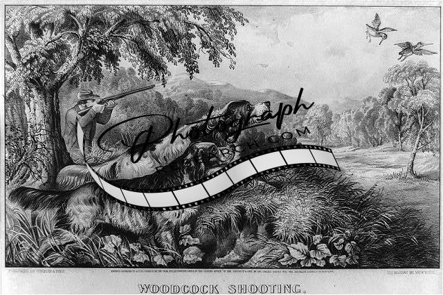 Woodcock shooting,hunter,dogs,rifle,c1870,Currier & Ives photo,wooded area