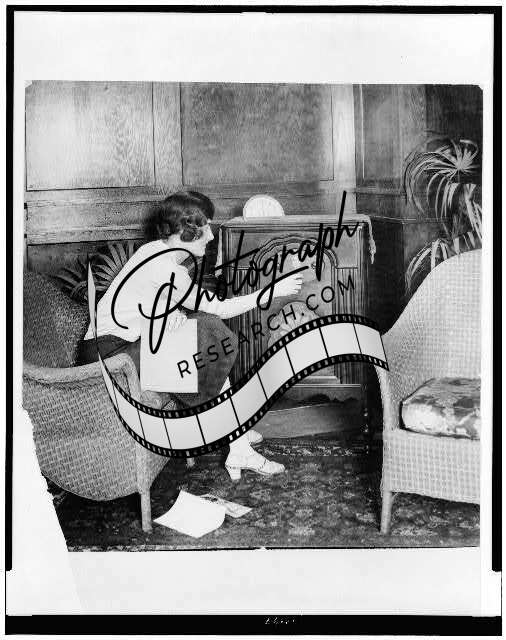 Young woman tuning a radio,1920-1932,Living Room,Chairs,Plants