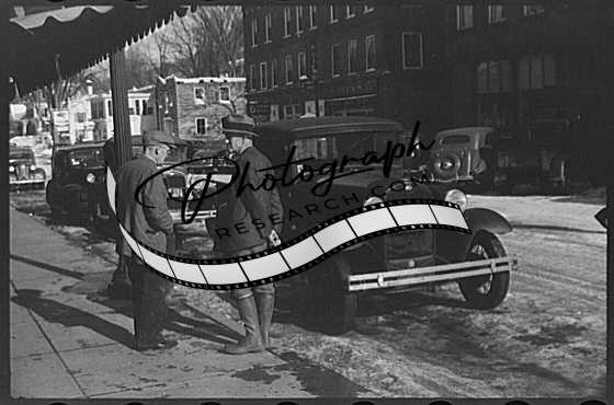 Title: Townspeople of Woodstock, Vermont, discussing the severe winter on the street corner in center of town