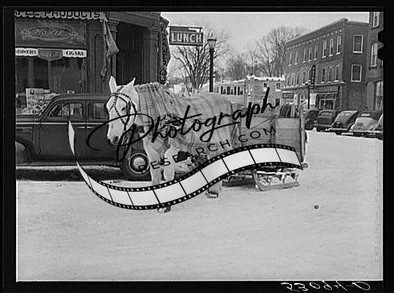 Horses hauling frozen truck to gas station. Woodstock,Vermont