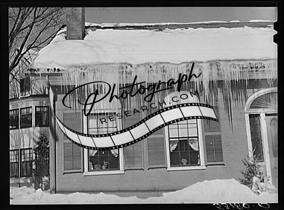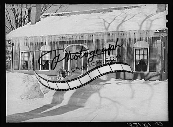 Title: Snow slides off the roof and piles high in front of window of farmhouses. Woodstock, Vermont