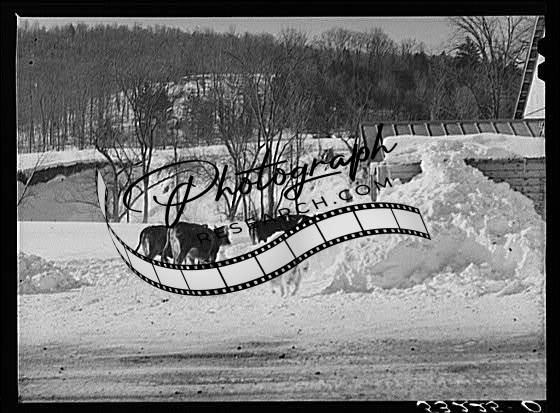 Title: Farmer's son and collie dog driving the cows back to the barn after watering them at the brook. All other sources of water supply were frozen for two months during very severe winter. Clinton Gilbert's farm. Woodstock, Vermont