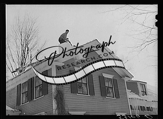 Shoveling heavy snow off roof of house in Woodstock,Vermont