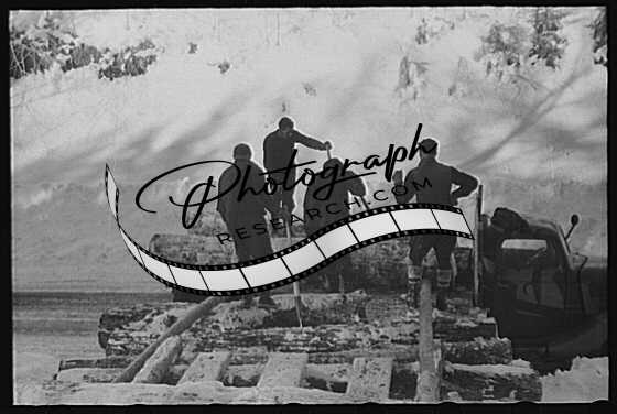 Title: Hired man on Gilbert farm emptying load of manure after cleaning out the dairy barn early on a winter morning. Woodstock, Vermont
