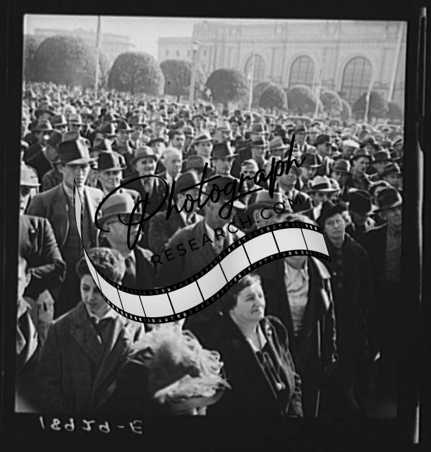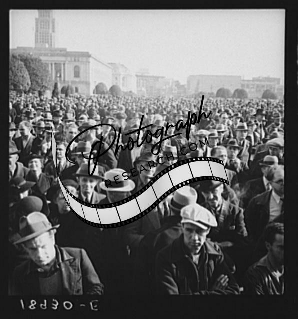Title: Listening to speeches at mass meeting of Works Progress Administration (WPA) workers protesting congressional cut of relief appropriations. San Francisco, California