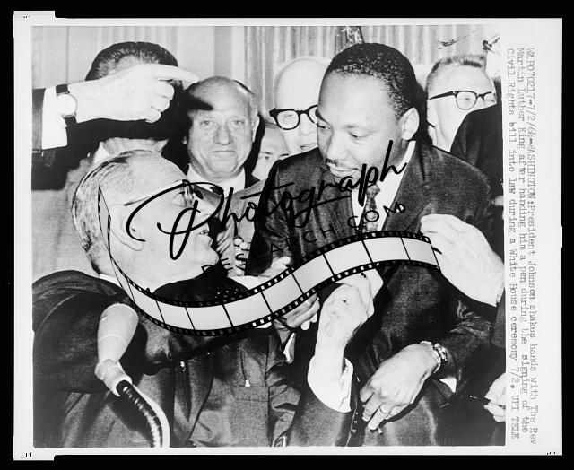 President Johnson shakes hands with The Rev. Martin Luther King after handing him a pen during the signing of the Civil Rights bill into law during a White House ceremony 7/2