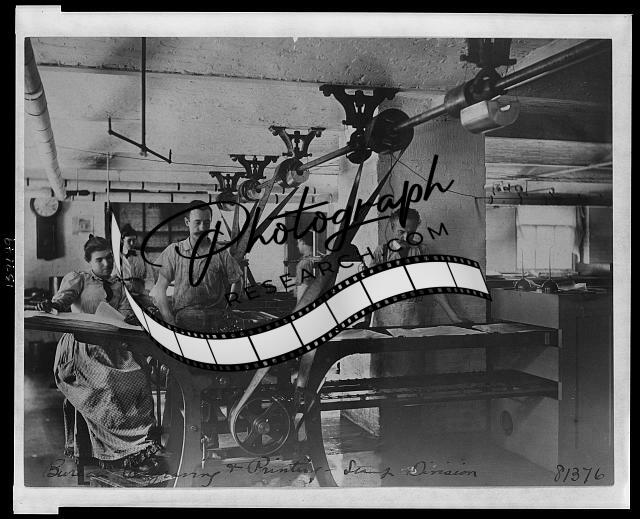 Summary: Photograph shows men working on machines powered by steam driven belts.