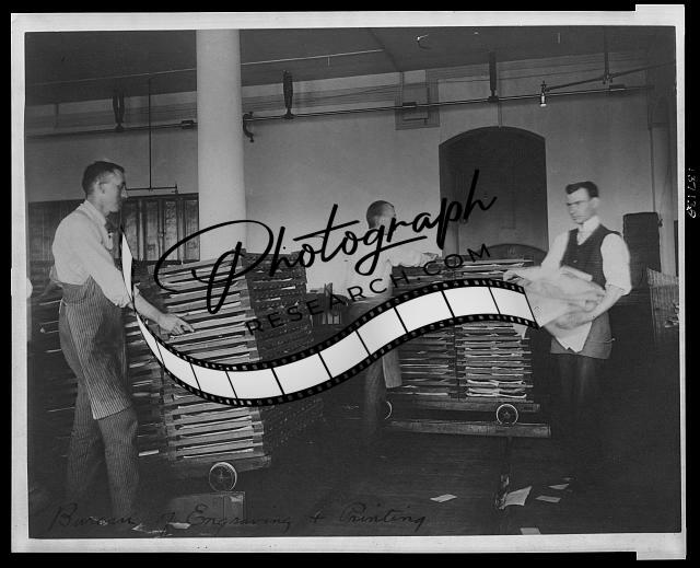 Title: Workers taking mucilaged sheets of postage stamps from the drying box in the gumming and drying room of the Stamp Division at the Bureau of Engraving & Printing
