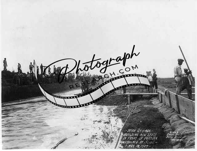 Title: [Workers unloading sandbags from flatbed railroad car, while others are building a levee, partially submerged electric power line poles on right] / Ewing, Inc., Baton Rouge.