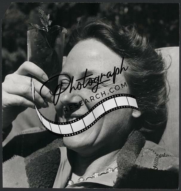 Helen Kleberg holding a glass of iced tea to her temple, Sherrewogue, Saint James, New York