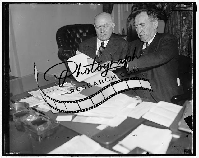 Title: World War ace at air safety conference. Washington D.C. Appearing at the Air Safety Conference today at the Department of Commerce, Eddie Rickenbacker, famous World War Ace and now a prominent air line official, proposed that a special review board be established to study causes of air crashes in which a conflict of opinion arises between airline operators and the Bureau of Air Commerce Rickenbacker made the Proposal after viewing a Chart Displayed by Gene Vidal, Air Commece Director, Listing the Primary Cause of 16 of 27 Accidents as Due to 'Pilot's Error' Director Vidal (right) Agreed with Rickenbacker, Adding, However, that he was not Speaking for the Department but for himself.