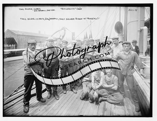 Roosevelt's crew: 1st Mate Gushie,Chief Eng. Wardwill & the men,standing on ship