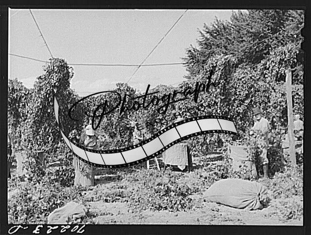 Title: Pulling down vines in hop field. The hops or burns are then picked from the vines. Yakima County, Washington
