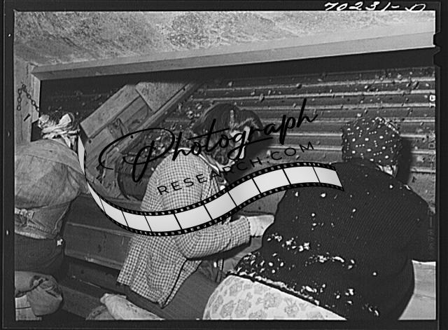 Title: Scooping and sweeping dried hops from drying room to adjacent room where they will be baled. Yakima County, Washington. There is approximately twenty-five percent dryout of hops