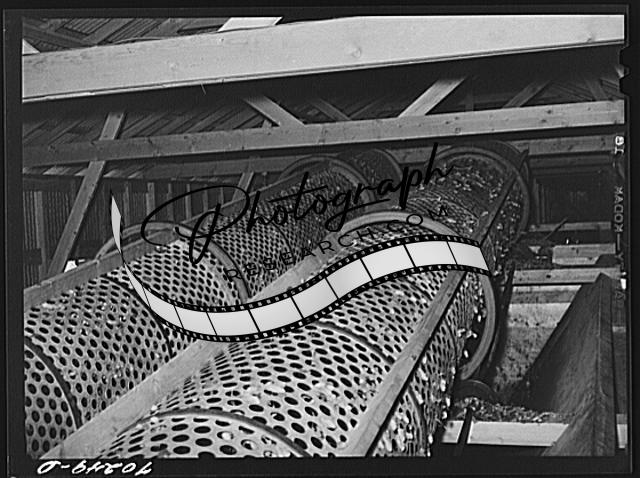 Title: Hop vines going in stationary-type mechanical picker. Yakima County, Washington