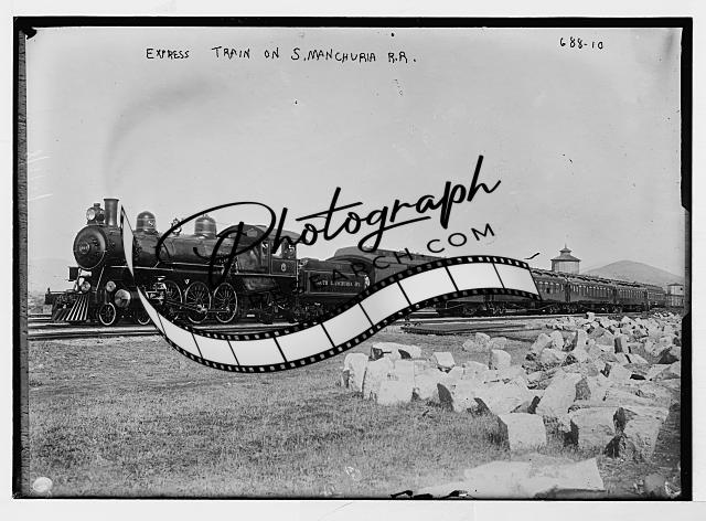 Express train on S. Manchurian R.R.,view of engine,cars on track,locomotive