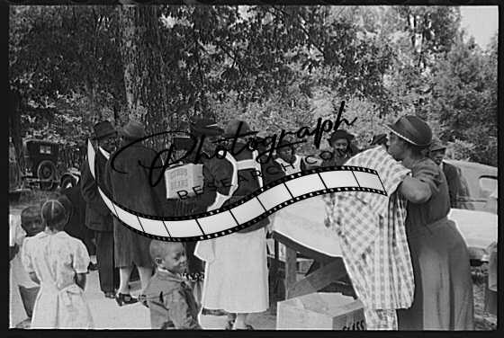 Title: Cleaning up and visiting after outdoor picnic at an all-day ministers and deacons meeting. Near Yanceyville, Caswell County, North Carolina