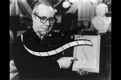 Andrés Segovia,holding drawing of man plucking ancient stringed instrument