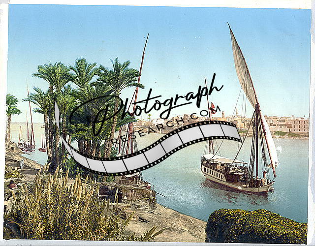 Sailboat on the Nile,Cairo,Egypt,1890-1900,Waterfront,Sailboat,palm trees