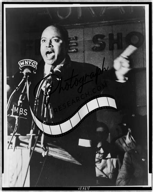 James Farmer,speaking,microphones outside Hotel Theresa,Civil Rights Activist