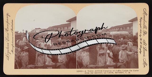 A newly arrived caravan of coffee laden ox carts from the interior, La Union, Sa