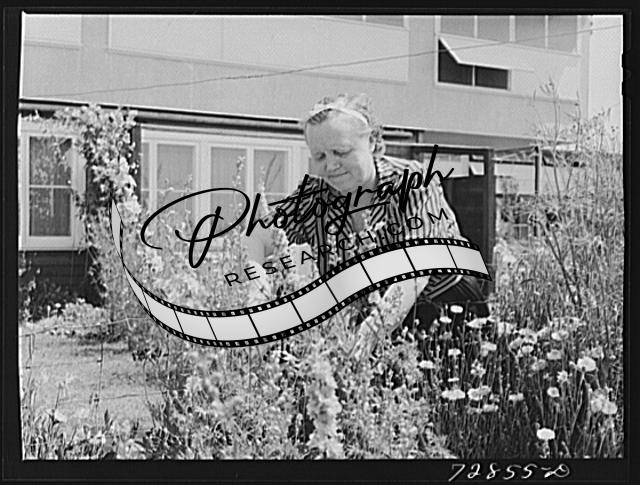 Title: Mrs. Carl Bjorkquist in her flower garden in the rear of her apartment at the FSA (Farm Security Administration) farm workers community. Yuba City, California
