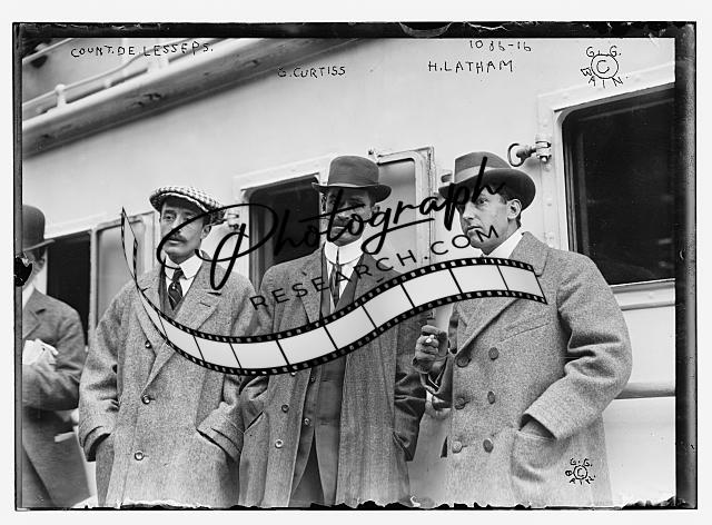 Count de Lesseps,Glenn Hammond Curtiss,Hubert Latham on train platform,1910