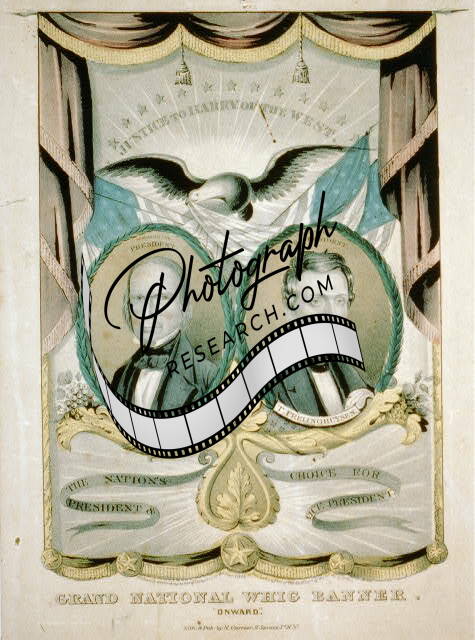 Summary: Print shows a campaign banner for Whig presidential and vice presidential nominees for 1848, Zachary Taylor and Millard Fillmore. Unlike Currier's other Whig banners (nos. 1848-5 and -7) this example is horizontal rather than vertical in format. Bust portraits of the two candidates, Taylor in uniform on the left and Fillmore on the right, are framed with acanthus wreaths, and set side-by-side against a dressed stone wall on which are incised three stars. The candidates are turned slightly toward each other and appear against a sky background. The banner compares closely with another banner which Currier produced for the Cass-Butler ticket (no. 1848-9). Taylor and Fillmore were nominated on June 9, 1848, and this print probably appeared soon thereafter. Although Taylor is here titled the 'People's Candidate for President,' Fillmore is merely called the 'Whig Candidate.'