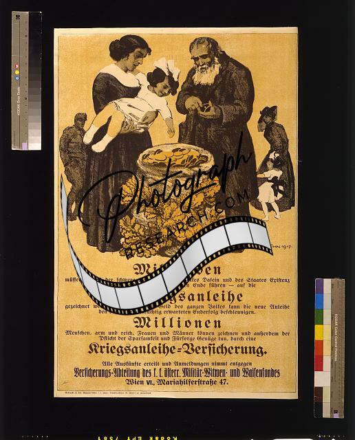 Summary: Poster shows framed picture of a medieval knight with a laurel wreath on his head reaching up to help a woman wearing a crown seated on a horse. In background, Vienna with St. Stephens Cathedral and the slogan 'Durch Sieg zum Frieden' (Peace through victory). Text: Subscribe to the War Loan, Bankhouse Schelhammer & Schattern.