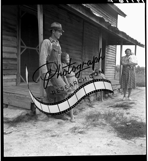 Title: Zollie Lyon, Negro sharecropper, home from the field for dinner at noontime, with his wife and part of his family. Note dog run. Wake County, North Carolina