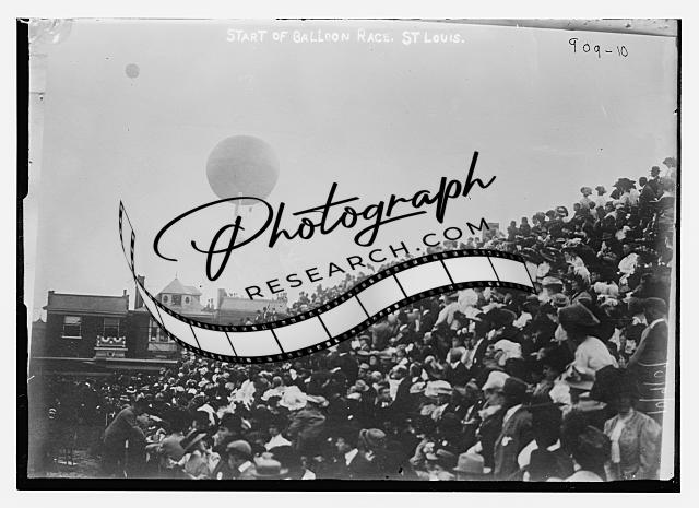 Crowd in stands,balloon overhead,at start of balloon race,St. Louis,October 1907